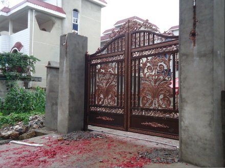 不要經(jīng)常用有水漬(或其他溶液)的手打開門鎖,以免其變色。在打開或轉(zhuǎn)動門鎖把手時,不要用力過猛,這樣會降低門鎖的使用壽命。合頁、門鎖等常用五金,一旦松動,應(yīng)立即擰緊.當(dāng)門鎖打開不正常時,可在鎖孔內(nèi)加入適量的鉛筆沫,切記用食用油等物品潤滑。, 漆面出現(xiàn)結(jié)皮或粗?,F(xiàn)象時,應(yīng)采取過濾措施,以免刷漆后漆膜不平整,堵塞噴槍。, 4、廠家的生產(chǎn)加工工藝:正規(guī)廠家生產(chǎn)的別墅鋁藝大門,其加工比較精細,切線流暢、角度一致,在拼接過程中應(yīng)該不會出現(xiàn)較明顯的縫隙,密封性能好,開關(guān)順暢。劣質(zhì)的庭院別墅大門,特別是鋁合金室外產(chǎn)品如果加工不合格,會出現(xiàn)密封性質(zhì)問題,不僅漏風(fēng)漏雨,而且在強風(fēng)和大的外力的作用下,玻璃會出現(xiàn)炸裂、脫落現(xiàn)象,從而給業(yè)主造成損失財物甚至傷人的現(xiàn)象。, 為保持鋁藝院門的原色,需對鋁藝院門進行兩次以上的磷化處理,在其表面形成一層保護膜,浸泡數(shù)分鐘,這之后還要經(jīng)過噴涂保護漆、230℃烘干、自然冷卻等步驟,才能完成一戶完整的鋁藝院門的表面色彩亮感。生產(chǎn)工藝,除油除銹除氧化-水洗-酸洗-拋光-水洗-中和-水洗-著色處理-洗滌-干燥及其他后處理。, 3、沖孔制作的,安裝比較簡單;